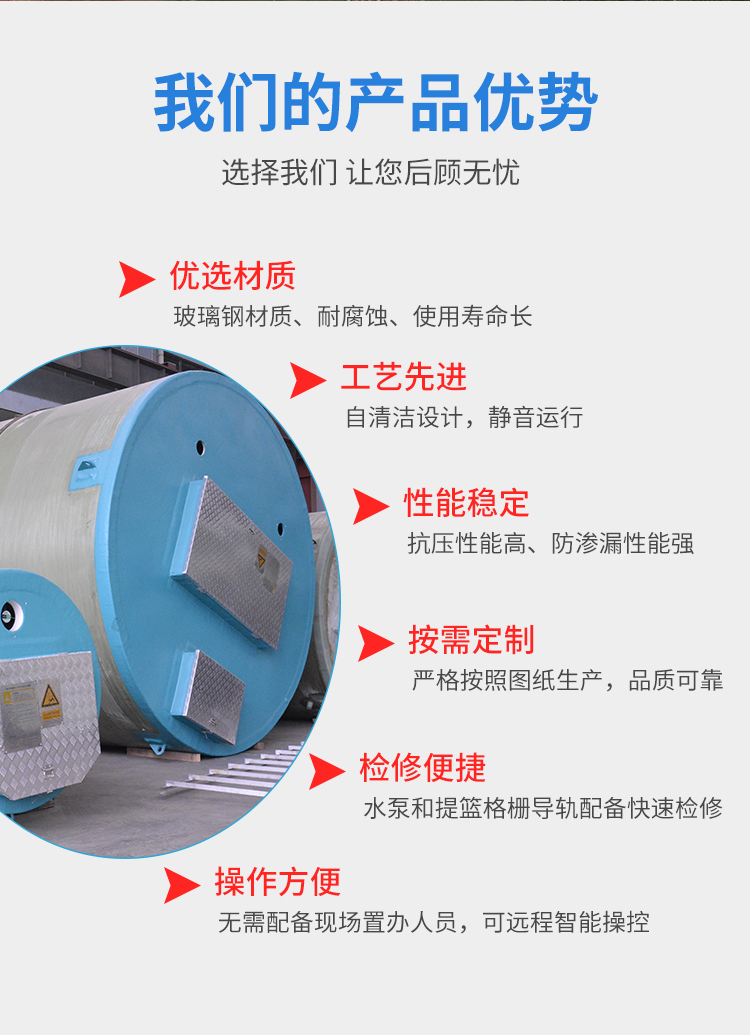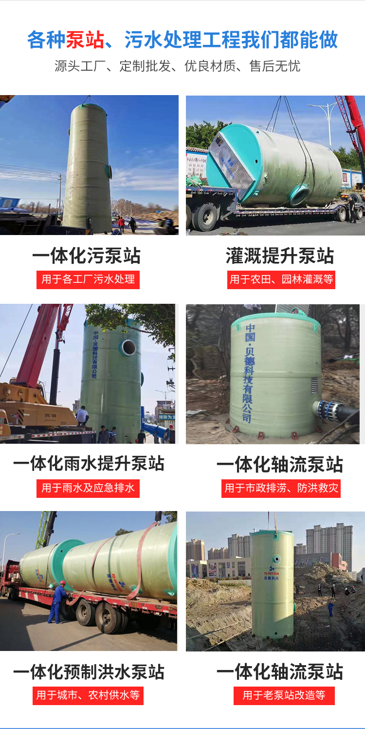 玻璃鋼一體化泵站是一款專為解決城市雨水收集和排澇以及城鎮(zhèn)污水提升而設(shè)計的新型污水處理設(shè)備。泵坑設(shè)計帶有一體化的排放連接。泵站為地埋式、泵站主體由泵站筒、潛水泵、耦合裝置、管道、閥門、液位傳感器、控制系統(tǒng)、粉碎型格柵和通風(fēng)系統(tǒng)等部件組成。是一種使用方便,質(zhì)量可靠,土建工作少,成本較低的新型一體化泵站設(shè)備,容積優(yōu)化是其顯著的特征,可以作為中小型混凝土泵站的替代品。